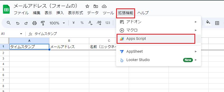 上のツールバーの【拡張機能】→【AppsScript】をクリックします。