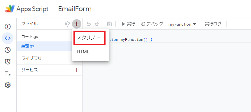 左上の【+】→【スクリプト】を選択して、新しいファイルを名前を付けて作成します。