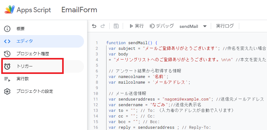 さきほど作成した関数が選択されている状態で、スクリプトエディタの画面左側のメニューから「トリガー」の時計マークをクリックします。