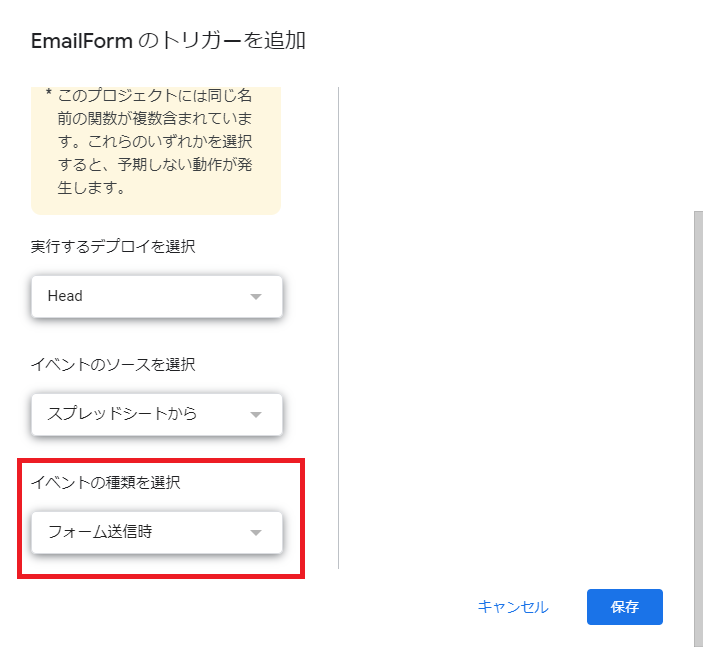 「イベントの種類を選択」のところは【フォーム送信時】を選択します。