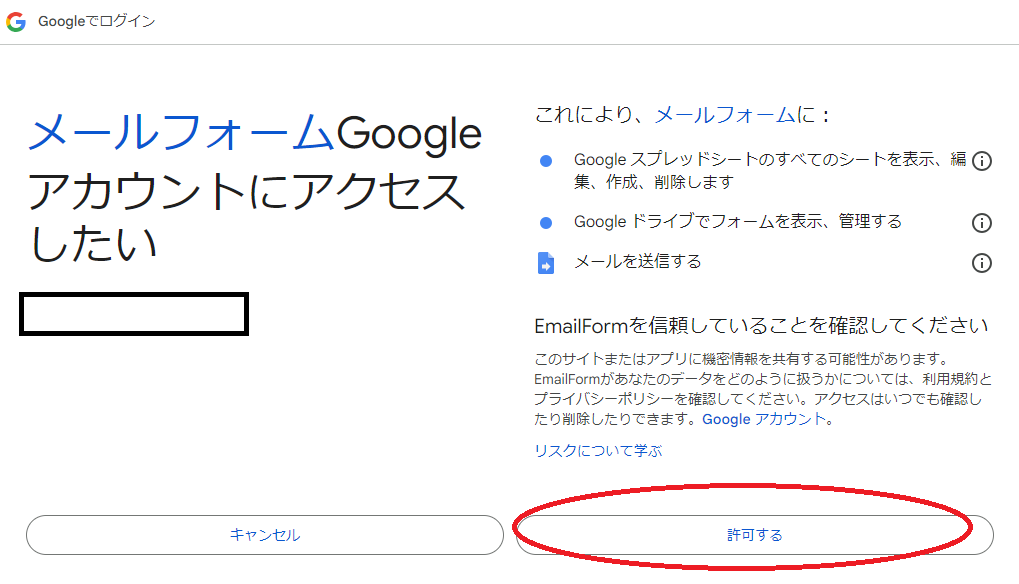 - 権限の確認と許可: スクリプトがあなたのGoogleアカウントの情報にアクセスするために必要な権限が表示されます。 内容を確認し、問題なければ「許可」をクリックします。