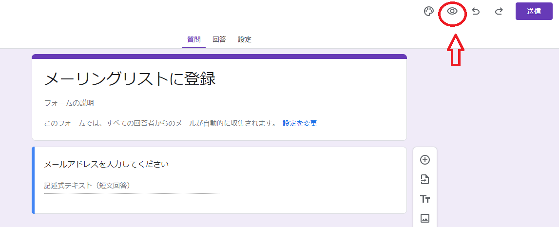 フォームを開く: Googleフォームの編集画面から、「プレビュー」ボタンをクリックしてフォームを開きます。