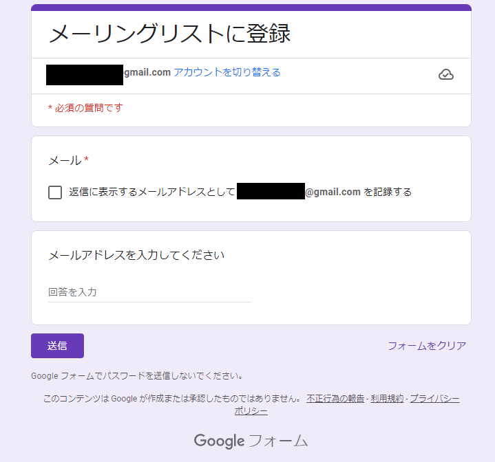 必要事項を入力: メールアドレスなど、フォームで設定した質問項目に必要事項を入力します。